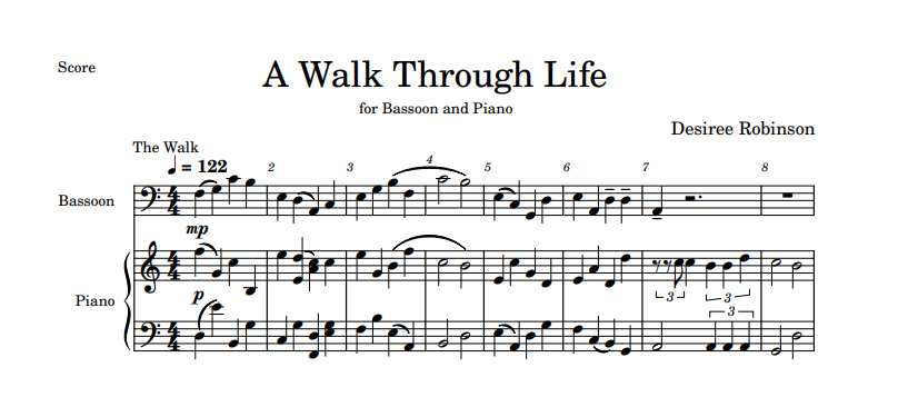 ‘A Walk Through Life for Bassoon and Piano’ is a short and episodic duet in sectional form. Though brief, it journeys through eight different phases. Like moments in life, no two scenes are exactly the same, though the previous scene can inform the one that follows it. It is roughly 4 minutes and 19 seconds long. Your score and parts will be e-mailed to you as soon as possible upon receipt of your payment! (Expect it within 2 to 14 business days.) Thank you in advance for your purchase!